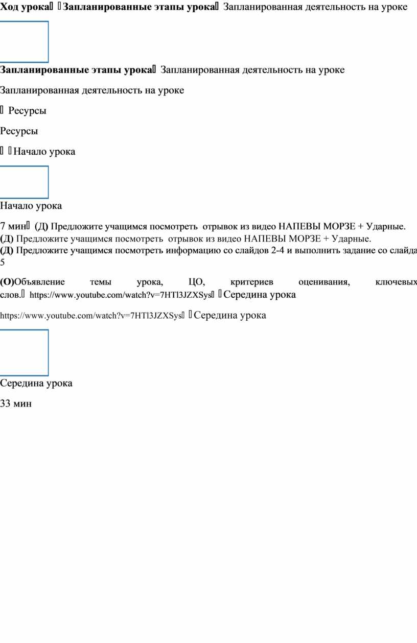 (Д) Предложите учащимся посмотреть отрывок из видео НАПЕВЫ МОРЗЕ + Ударные.(Д) Предложите учащимся посмотреть информацию со слайдов 2-4 и выполнить задание со слайда 5 (О)Объявление темы урока, ЦО, критериев оценивания, ключевых слов. |