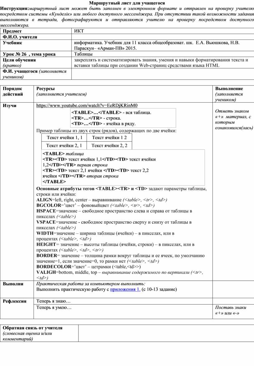 Инструкция:маршрутный лист может быть заполнен в электронном формате и отправлен на проверку учителю посредством системы «Кунделiк» или любого доступного мессенджера. При отсутствии такой возможности задания выполняются в тетради, фотографируются и отправляются учителю на проверку посредством доступного мессенджера.
