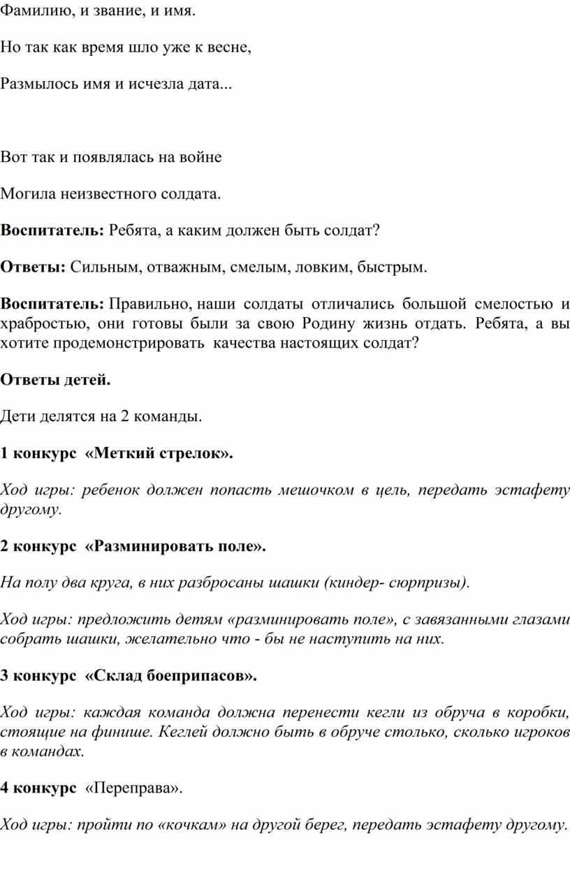 Воспитатель: Молодцы, ребята. Вы выполнили все задания. В будущем вы станете настоящими защитниками своей Родины. Ребята, как вы считаете, кто же они - неизвестные солдаты далёкой войны?