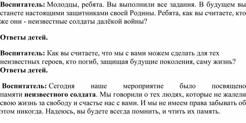 Воспитатель: Сегодня наше мероприятие было посвящено памяти неизвестного солдата. Мы говорили о тех людях, которые не жалели свою жизнь за свободу и счастье нас с вами. И мы не имеем права забывать об этом никогда. Надеюсь, вы будете всегда помнить, и чтить их память.