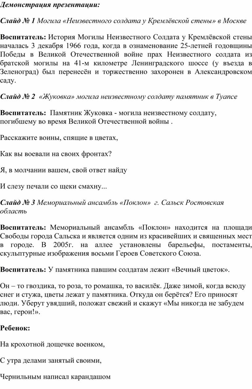 Воспитатель: Правильно, значит это – никому неизвестно, что произошло с этим бойцом. Героев Великой Отечественной войны много. Но имена многих тысяч солдат, совершивших подвиги и отдавших жизнь за Родину, остались, к сожалению, неизвестными. Если открыть любую изданную в нашей стране «Книгу памяти», то напротив огромного числа фамилий советских солдат, не вернувшихся с Великой Отечественной войны, написано – «пропал без вести». У многих, кто числится убитым, не указано место захоронения и их останки лежат в полях, лесах и болотах России. Лишь немногим героям удается вернуть имена, остальные так и остаются «неизвестными солдатами». Именно поэтому президент нашей страны подписал указ о праздновании праздника «Дня неизвестного солдата». Чтобы сохранить народную память о них, во многих городах, где велись ожесточенные бои, есть могилы Неизвестного солдата, мемориалы и памятники. Возле них горит «вечный огонь», к ним возлагают цветы те, чью мирную жизнь они отстояли в боях.