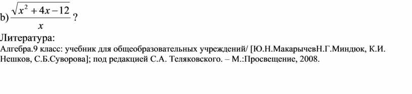 Алгебра.9 класс: учебник для общеобразовательных учреждений/ [Ю.Н.МакарычевН.Г.Миндюк, К.И. Нешков, С.Б.Суворова]; под редакцией С.А. Теляковского. – М.:Просвещение, 2008.
