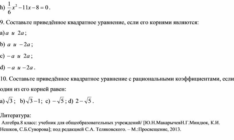 10. Составьте приведённое квадратное уравнение с рациональными коэффициентами, если один из его корней равен: