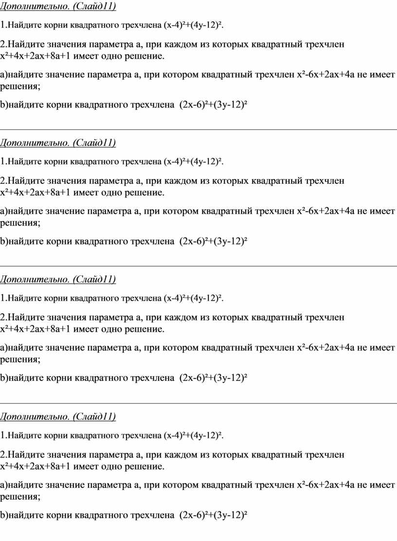 1.Найдите корни квадратного трехчлена (x-4)²+(4y-12)².
