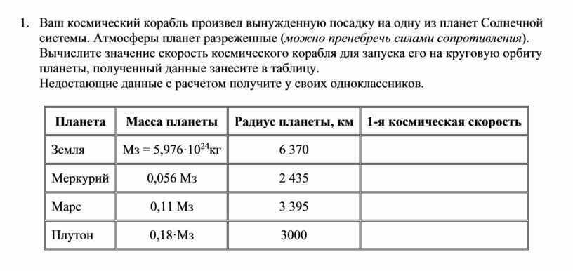 Вычислите значение скорость космического корабля для запуска его на круговую орбиту планеты, полученный данные занесите в таблицу.