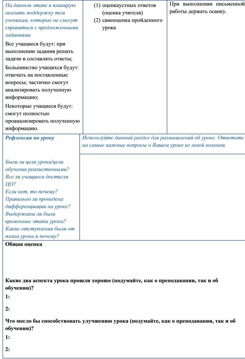 Были ли цели урока/цели обучения реалистичными? Все ли учащиеся достигли ЦО? Если нет, то почему? Правильно ли проведена дифференциация на уроке? Выдержаны ли были временные этапы урока? Какие отступления были от плана урока и почему? |