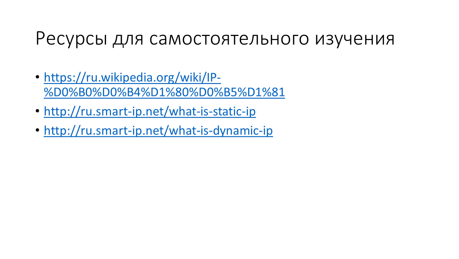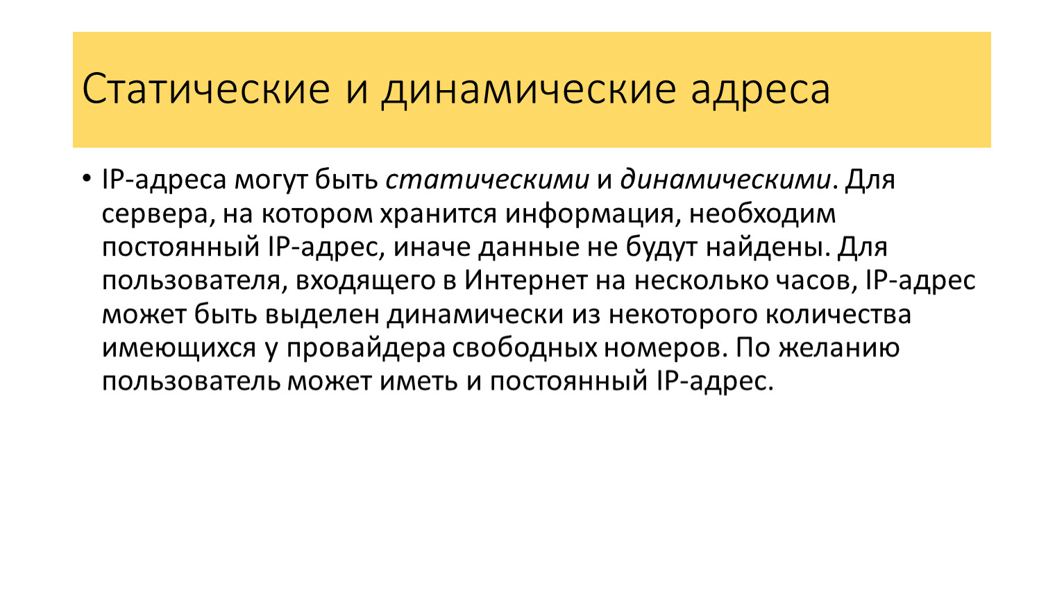 IP-адреса могут быть статическими и динамическими. Для сервера, на котором хранится информация, необходим постоянный IP-адрес, иначе данные не будут найдены. Для пользователя, входящего в Интернет на несколько часов, IP-адрес может быть выделен динамически из некоторого количества имеющихся у провайдера свободных номеров. По желанию пользователь может иметь и постоянный IP-адрес.