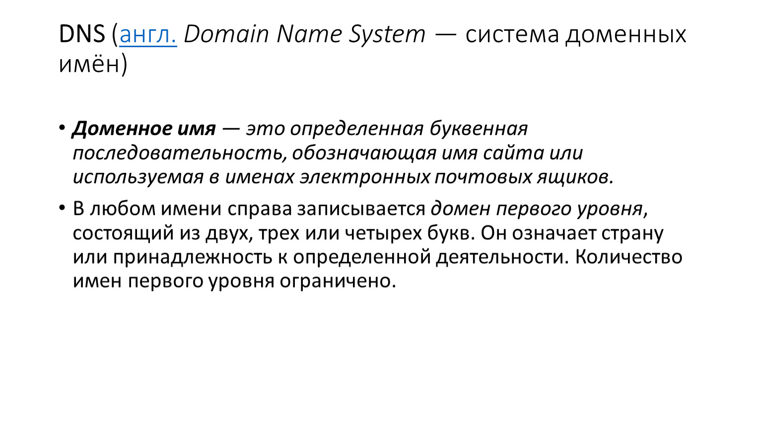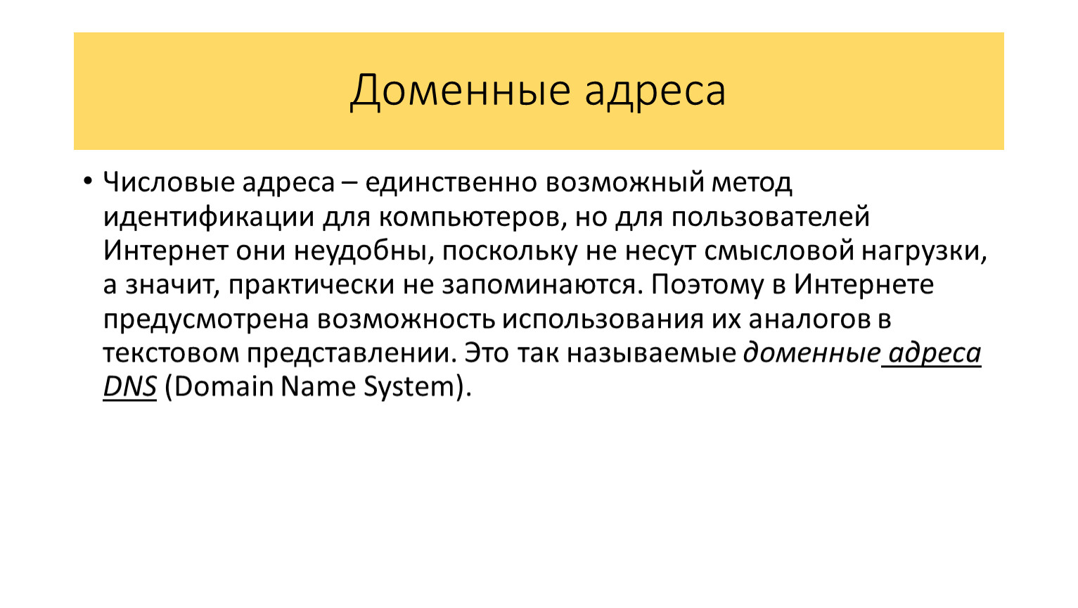 Числовые адреса – единственно возможный метод идентификации для компьютеров, но для пользователей Интернет они неудобны, поскольку не несут смысловой нагрузки, а значит, практически не запоминаются. Поэтому в Интернете предусмотрена возможность использования их аналогов в текстовом представлении. Это так называемые доменные адреса DNS (Domain Name System).