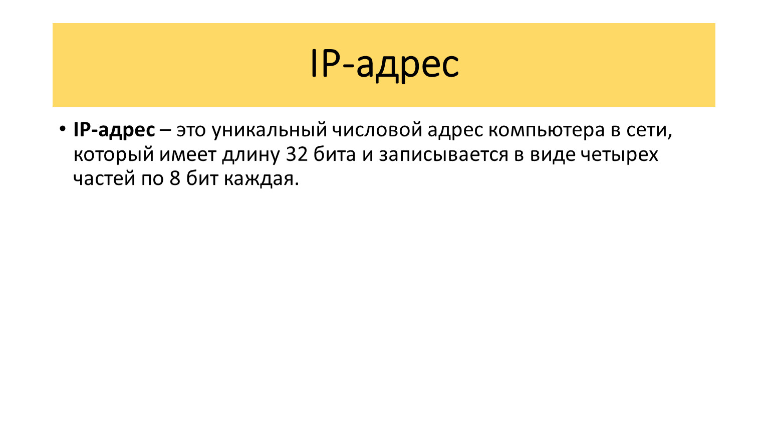 IP-адрес – это уникальный числовой адрес компьютера в сети, который имеет длину 32 бита и записывается в виде четырех частей по 8 бит каждая.