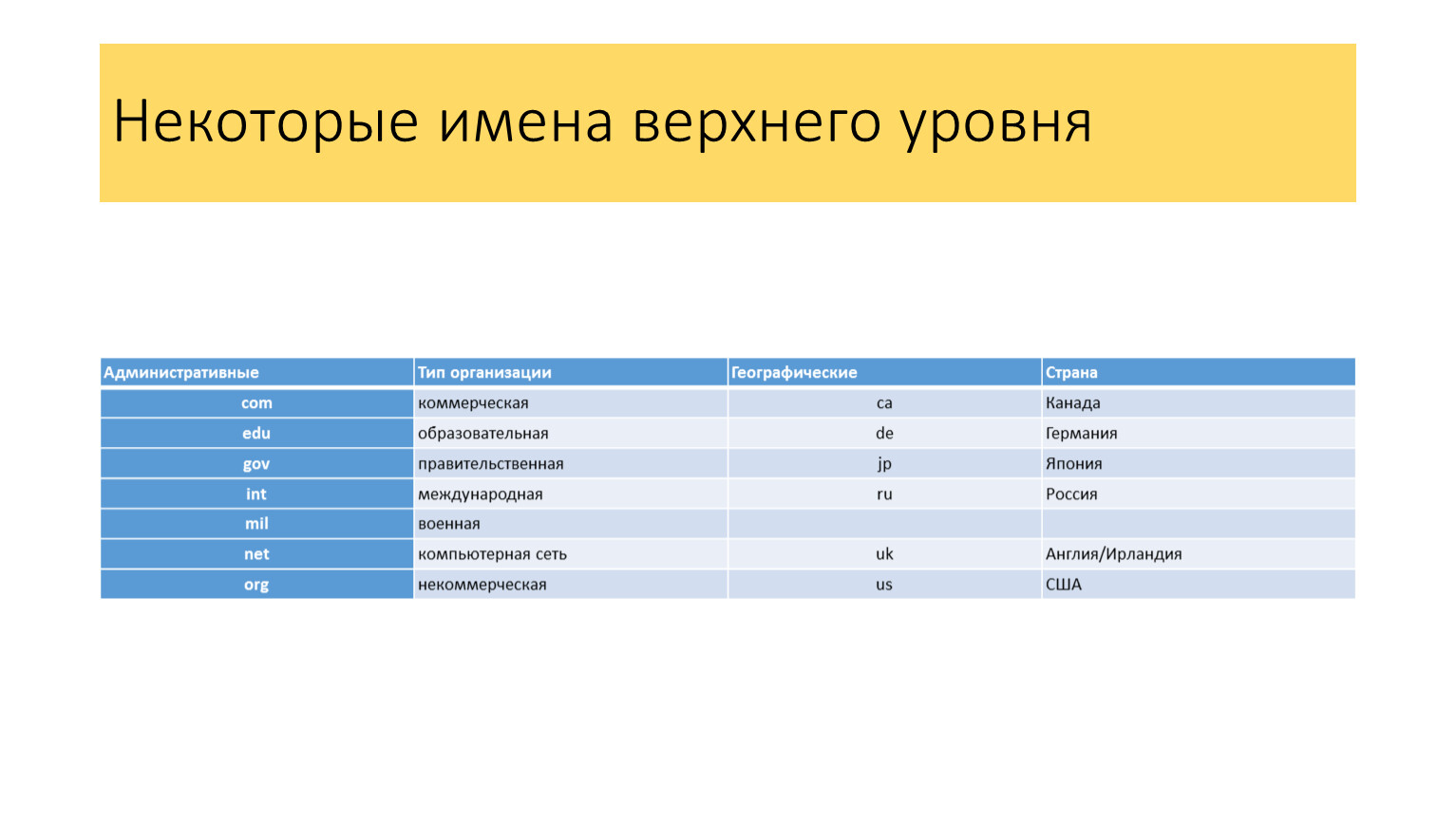 Сначала InterNIC – организация, ответственная за систему имен – ввела в обращение семь доменных имен первого уровня. Т.к. система доменных имен впервые появилась в США, то эти семь доменов по умолчанию означают, что хост расположен на территории США.