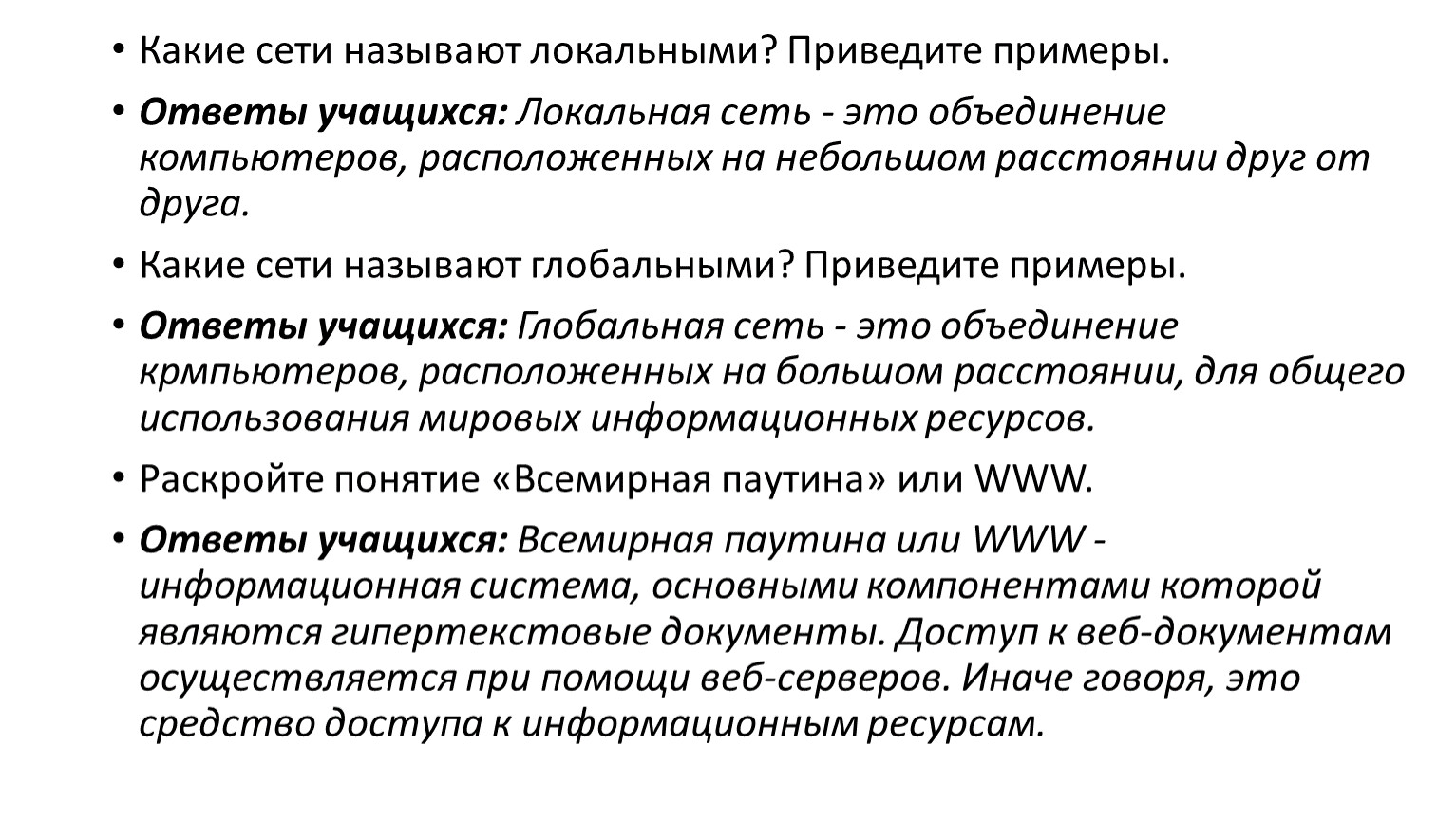 Ответы учащихся: Локальная сеть - это объединение компьютеров, расположенных на небольшом расстоянии друг от друга.