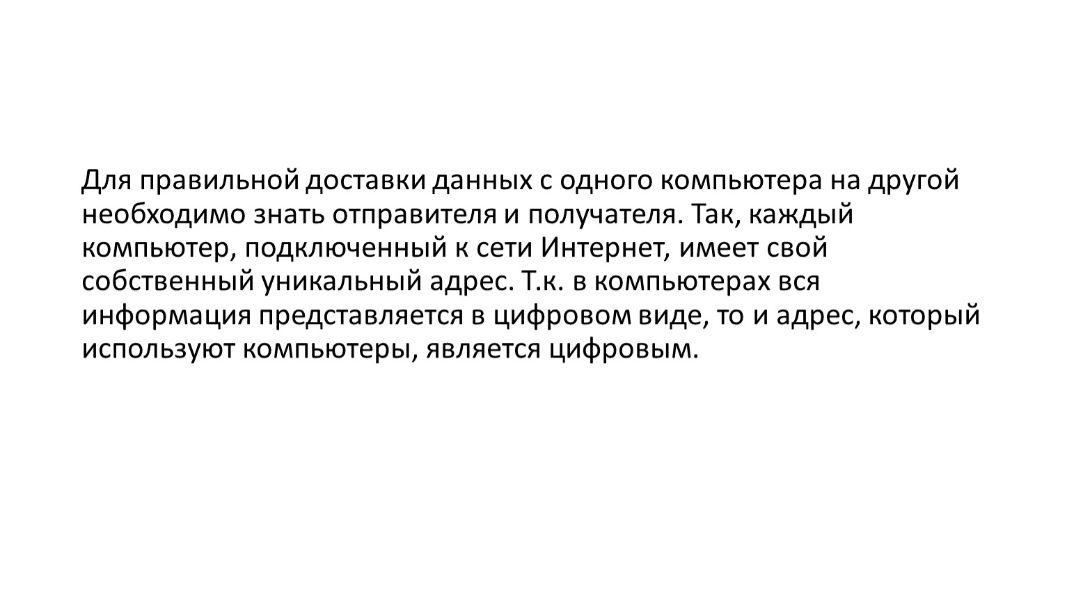 Для правильной доставки данных с одного компьютера на другой необходимо знать отправителя и получателя. Так, каждый компьютер, подключенный к сети Интернет, имеет свой собственный уникальный адрес. Т.к. в компьютерах вся информация представляется в цифровом виде, то и адрес, который используют компьютеры, является цифровым.