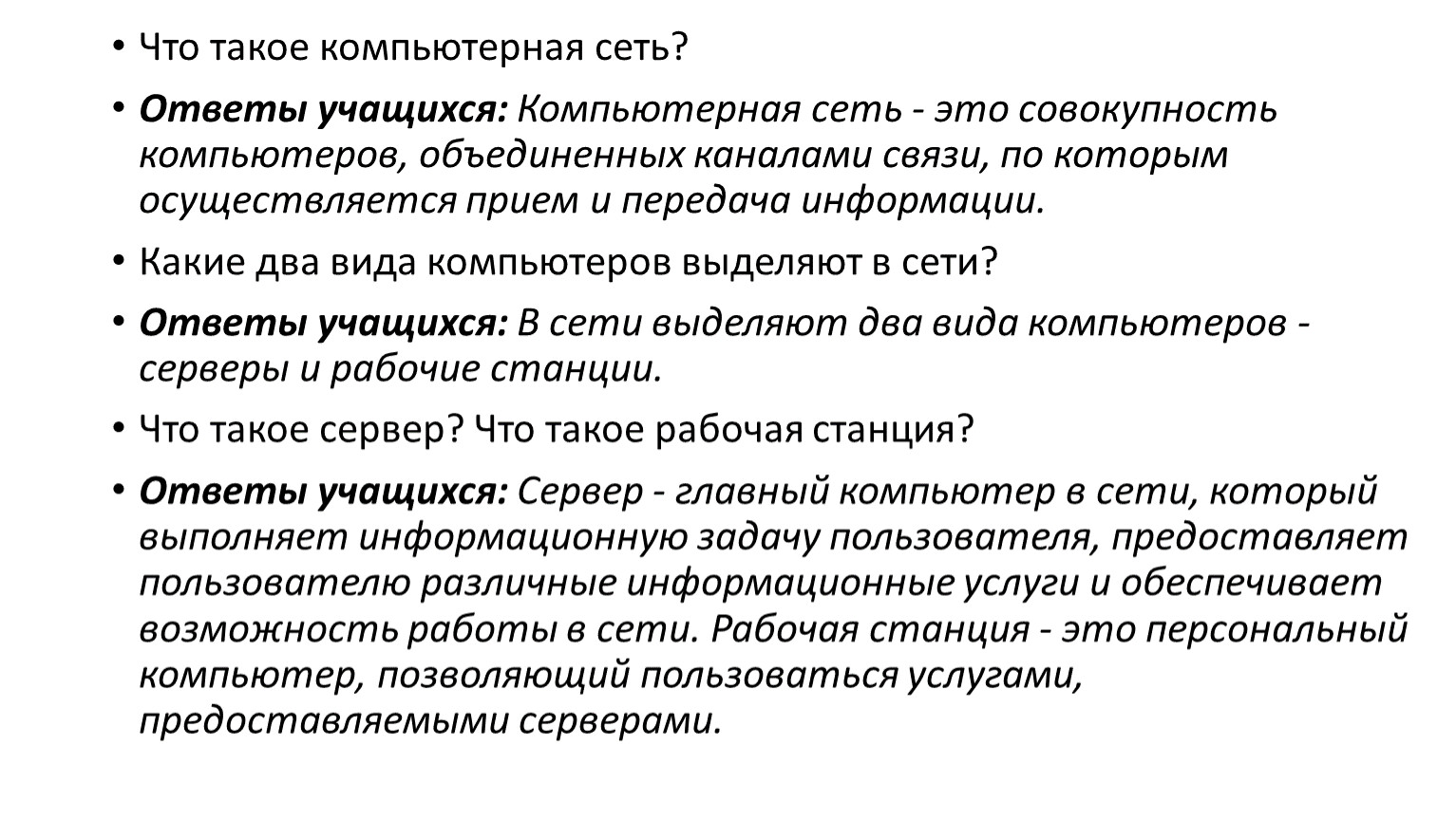 Ответы учащихся: В сети выделяют два вида компьютеров - серверы и рабочие станции.