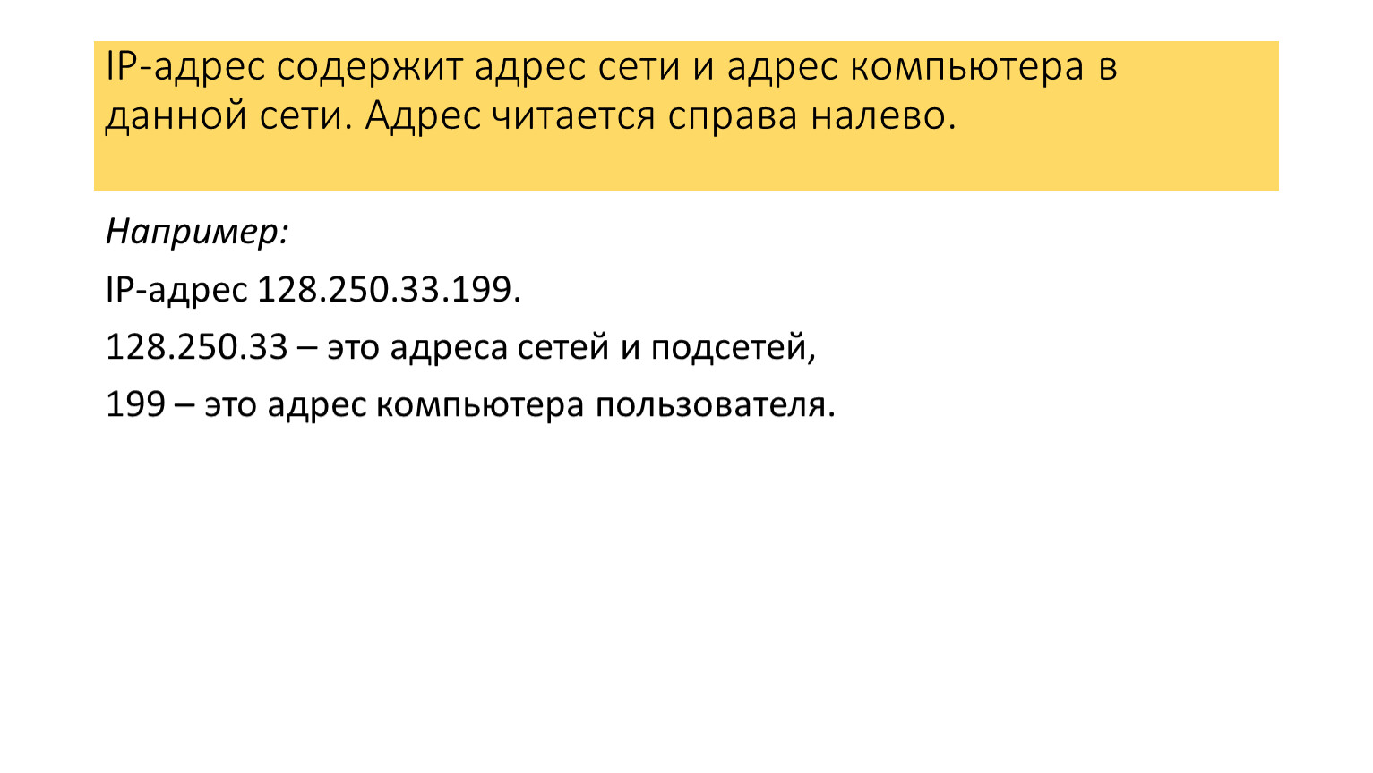 IP-адрес содержит адрес сети и адрес компьютера в данной сети. Адрес читается справа налево.