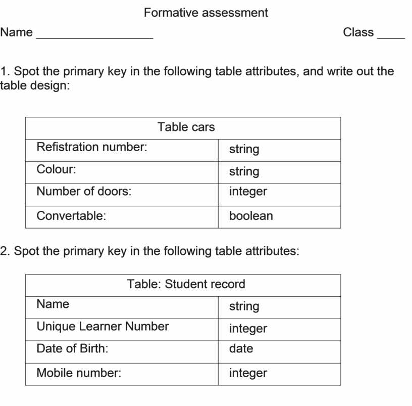 1. Spot the primary key in the following table attributes, and write out the table design:
