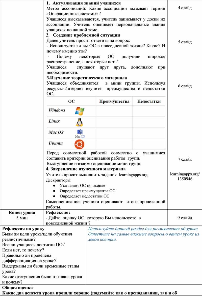 Перед совместной работой совместно с учащимися составить критерии оценивания работы групп. Выступление и взаимо оценивание мини групп. 4. Закрепление изученного материала Учитель просит выполнить задания learningapps.org. Дескрипторы: ● Указывает ОС по иконке ● Определяет преимущества ОС ● Определяет недостатки ОС Самооценивание: ученики оценивают итоги проделанной работы. |