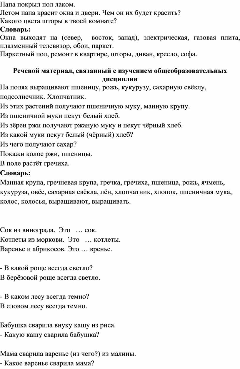 Речевой материал, связанный с изучением общеобразовательных дисциплин