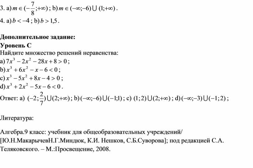 Алгебра.9 класс: учебник для общеобразовательных учреждений/ [Ю.Н.МакарычевН.Г.Миндюк, К.И. Нешков, С.Б.Суворова]; под редакцией С.А. Теляковского. – М.:Просвещение, 2008.