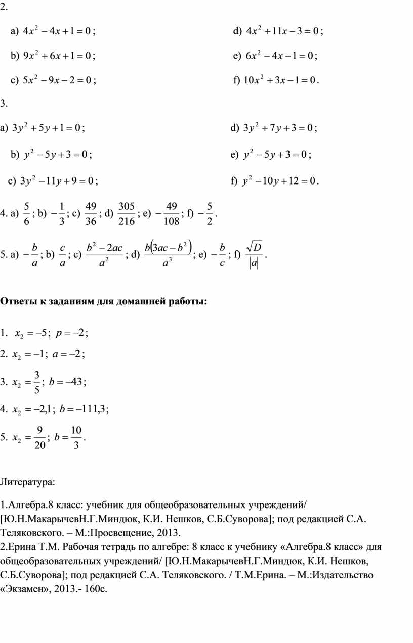 2.Ерина Т.М. Рабочая тетрадь по алгебре: 8 класс к учебнику «Алгебра.8 класс» для общеобразовательных учреждений/ [Ю.Н.МакарычевН.Г.Миндюк, К.И. Нешков, С.Б.Суворова]; под редакцией С.А. Теляковского. / Т.М.Ерина. – М.:Издательство «Экзамен», 2013.- 160с.