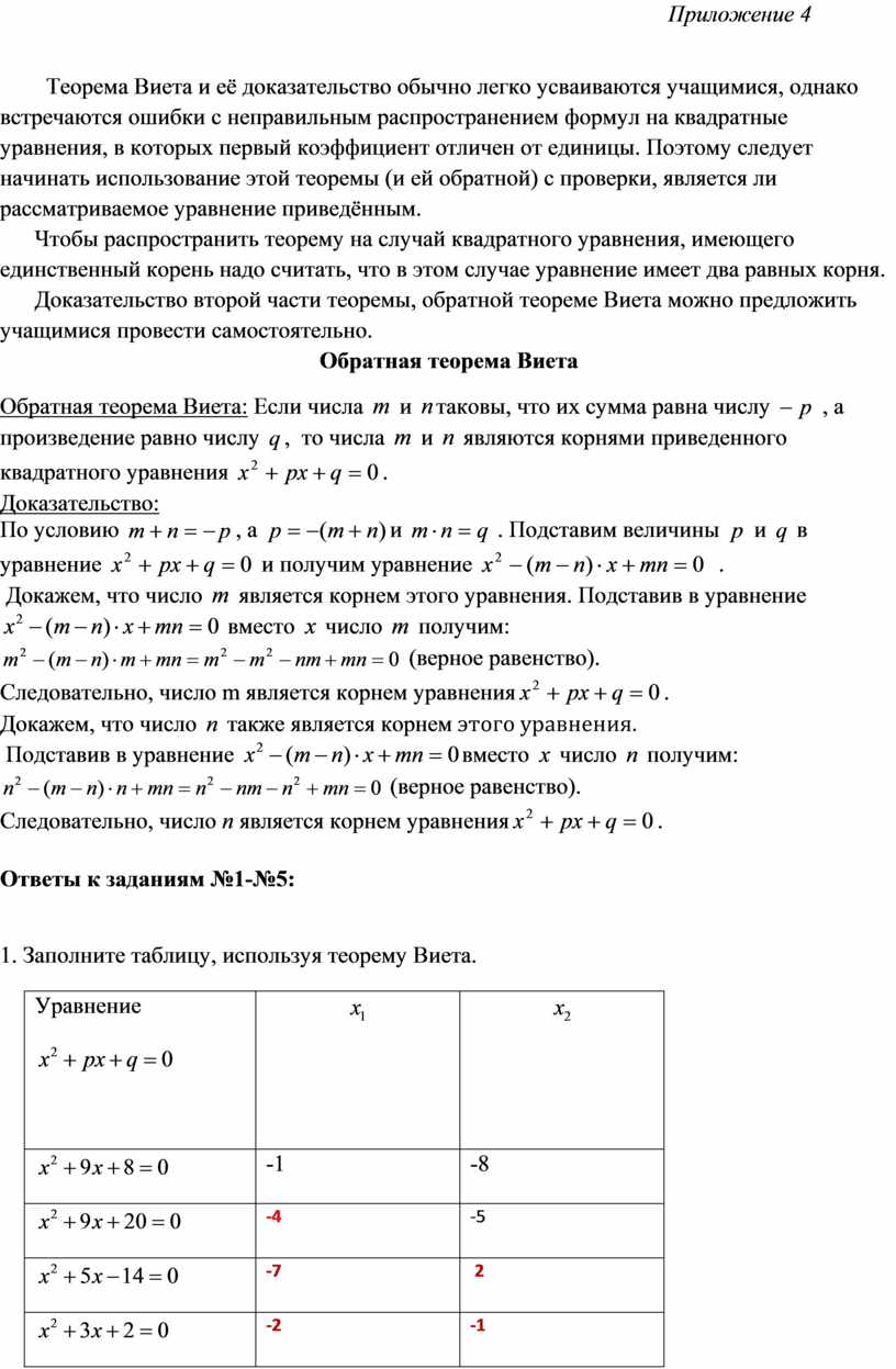 Доказательство второй части теоремы, обратной теореме Виета можно предложить учащимися провести самостоятельно.