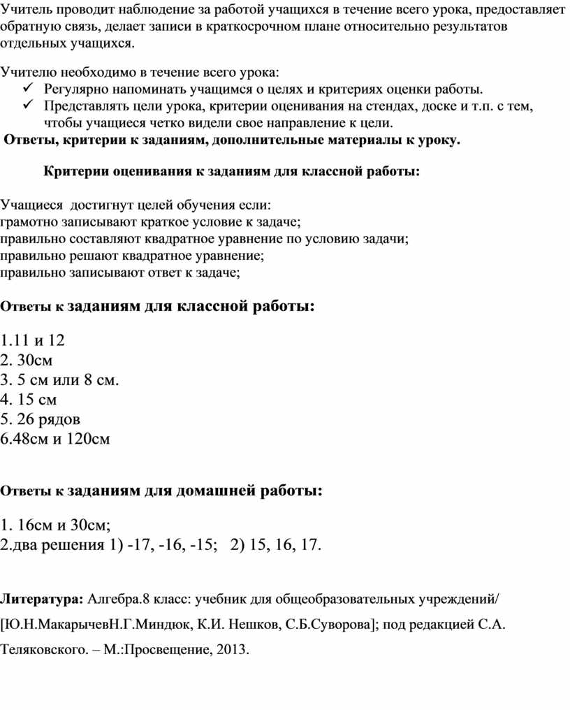 Литература: Алгебра.8 класс: учебник для общеобразовательных учреждений/ [Ю.Н.МакарычевН.Г.Миндюк, К.И. Нешков, С.Б.Суворова]; под редакцией С.А. Теляковского. – М.:Просвещение, 2013.