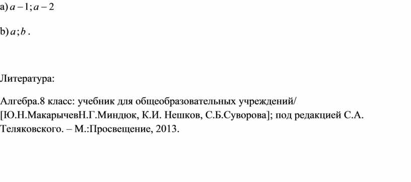 Алгебра.8 класс: учебник для общеобразовательных учреждений/ [Ю.Н.МакарычевН.Г.Миндюк, К.И. Нешков, С.Б.Суворова]; под редакцией С.А. Теляковского. – М.:Просвещение, 2013.