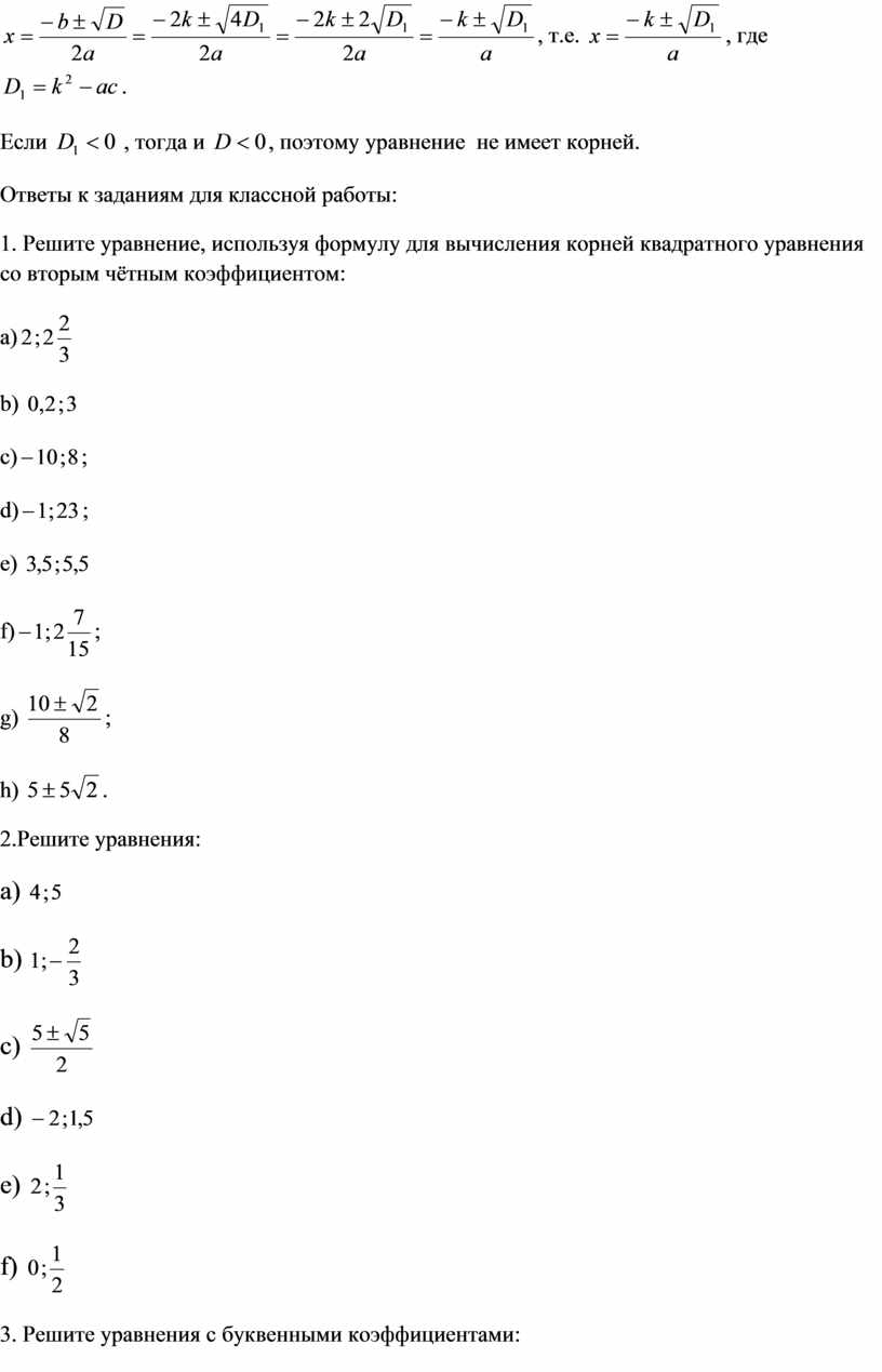 1. Решите уравнение, используя формулу для вычисления корней квадратного уравнения со вторым чётным коэффициентом: