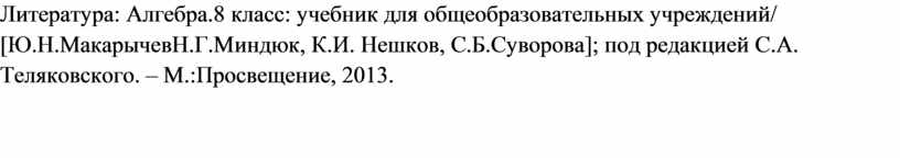 Литература: Алгебра.8 класс: учебник для общеобразовательных учреждений/ [Ю.Н.МакарычевН.Г.Миндюк, К.И. Нешков, С.Б.Суворова]; под редакцией С.А. Теляковского. – М.:Просвещение, 2013.