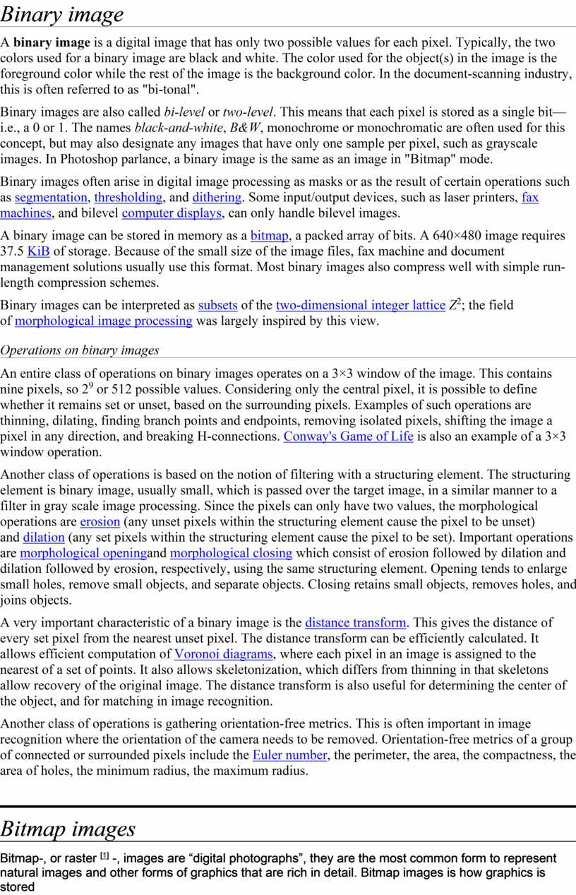Binary images often arise in digital image processing as masks or as the result of certain operations such as segmentation, thresholding, and dithering. Some input/output devices, such as laser printers, fax machines, and bilevel computer displays, can only handle bilevel images.