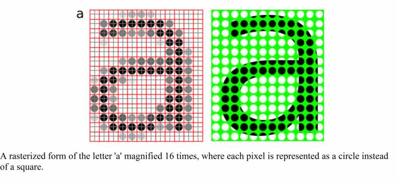 A rasterized form of the letter 'a' magnified 16 times, where each pixel is represented as a circle instead of a square.