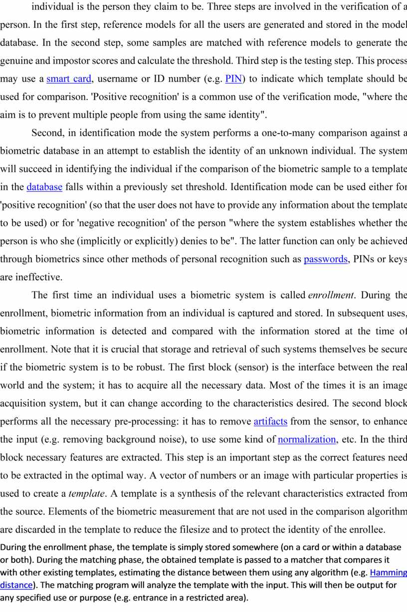 The first time an individual uses a biometric system is called enrollment. During the enrollment, biometric information from an individual is captured and stored. In subsequent uses, biometric information is detected and compared with the information stored at the time of enrollment. Note that it is crucial that storage and retrieval of such systems themselves be secure if the biometric system is to be robust. The first block (sensor) is the interface between the real world and the system; it has to acquire all the necessary data. Most of the times it is an image acquisition system, but it can change according to the characteristics desired. The second block performs all the necessary pre-processing: it has to remove artifacts from the sensor, to enhance the input (e.g. removing background noise), to use some kind of normalization, etc. In the third block necessary features are extracted. This step is an important step as the correct features need to be extracted in the optimal way. A vector of numbers or an image with particular properties is used to create a template. A template is a synthesis of the relevant characteristics extracted from the source. Elements of the biometric measurement that are not used in the comparison algorithm are discarded in the template to reduce the filesize and to protect the identity of the enrollee.