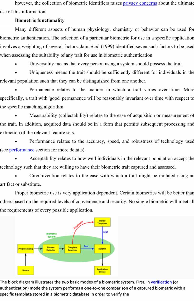 Many different aspects of human physiology, chemistry or behavior can be used for biometric authentication. The selection of a particular biometric for use in a specific application involves a weighting of several factors. Jain et al. (1999) identified seven such factors to be used when assessing the suitability of any trait for use in biometric authentication.