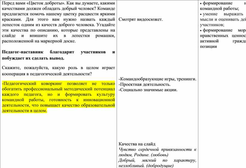 Да, согласна. Существует множество способов и приемов для эффективного тимбилдинга. Но, пожалуй, один из самых необходимых нашему обществу сегодня – это волонтерское движение и добровольческая деятельность. Видеосюжет из фильма «12 стульев», мотивирующий на кооперацию, совместную деятельность. Педагог-наставник побуждает участников к совместной деятельности. Для выполнения следующего задания приглашаю на сцену 3 добровольцев, которые образуют команду. Перед вами «Цветок доброты». Как вы думаете, какими качествами должен обладать добрый человек? Команде предлагается помочь нашему цветку расцвести яркими красками. Для этого вам нужно назвать каждый лепесток одним из качеств доброго человека. Угадайте эти качества по описанию, которые представлены на слайде и впишите их в лепестки ромашки, расположенной на маркерной доске.