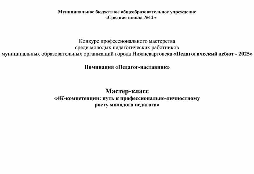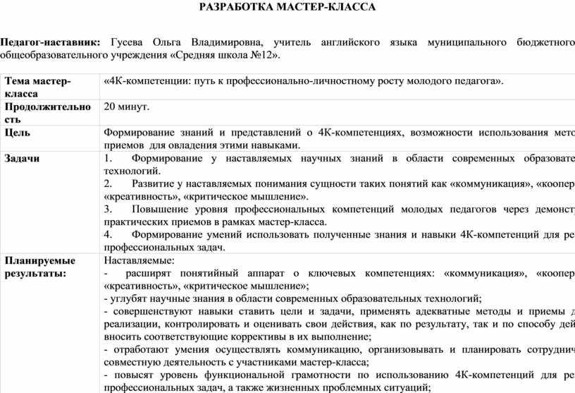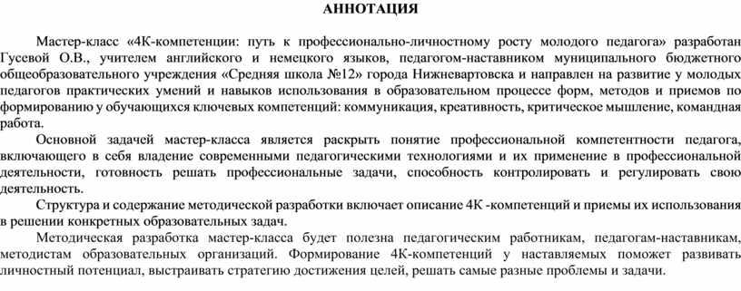 Мастер-класс «4К-компетенции: путь к профессионально-личностному росту молодого педагога» разработан Гусевой О.В., учителем английского и немецкого языков, педагогом-наставником муниципального бюджетного общеобразовательного учреждения «Средняя школа №12» города Нижневартовска и направлен на развитие у молодых педагогов практических умений и навыков использования в образовательном процессе форм, методов и приемов по формированию у обучающихся ключевых компетенций: коммуникация, креативность, критическое мышление, командная работа.