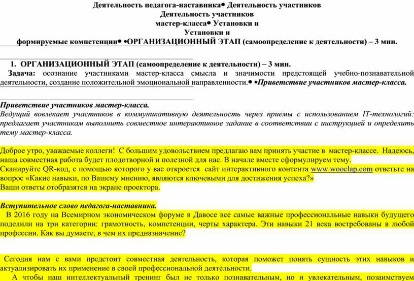 Доброе утро, уважаемые коллеги! С большим удовольствием предлагаю вам принять участие в мастер-классе. Надеюсь, наша совместная работа будет плодотворной и полезной для нас. В начале вместе сформулируем тему. Сканируйте QR-код, с помощью которого у вас откроется сайт интерактивного контента www.wooclap.com ответьте на вопрос «Какие навыки, по Вашему мнению, являются ключевыми для достижения успеха?» Ваши ответы отобразятся на экране проектора.