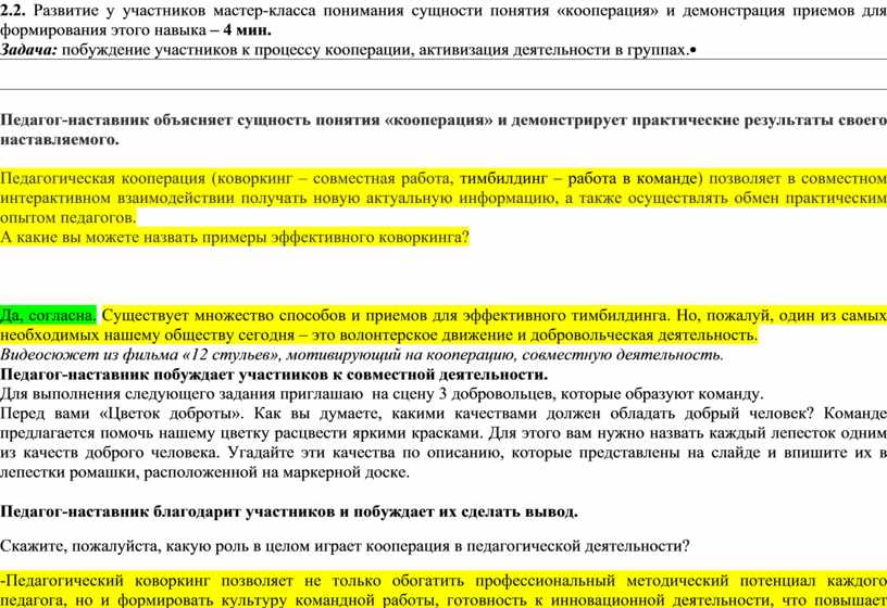 2.2. Развитие у участников мастер-класса понимания сущности понятия «кооперация» и демонстрация приемов для формирования этого навыка – 4 мин. Задача: побуждение участников к процессу кооперации, активизация деятельности в группах. |