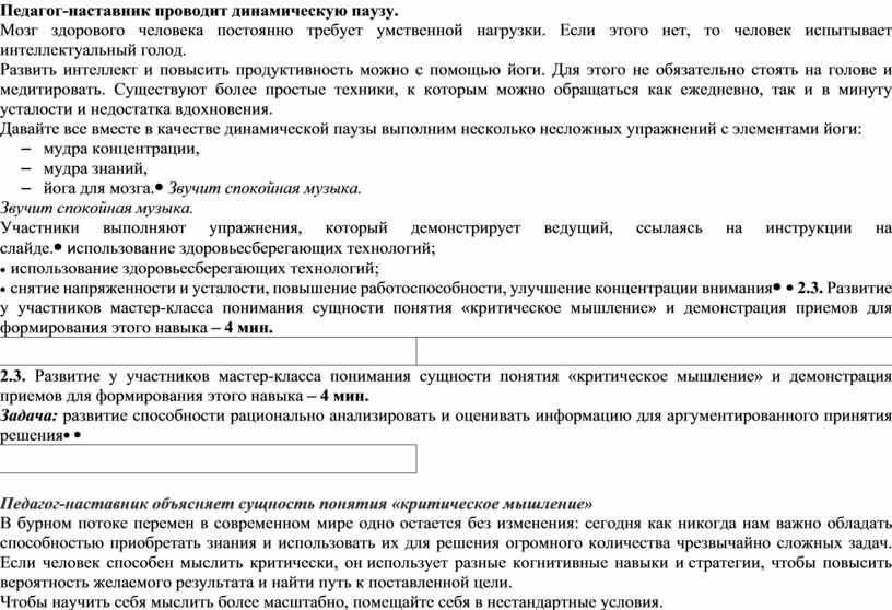 Педагог-наставник объясняет сущность понятия «критическое мышление» В бурном потоке перемен в современном мире одно остается без изменения: сегодня как никогда нам важно обладать способностью приобретать знания и использовать их для решения огромного количества чрезвычайно сложных задач. Если человек способен мыслить критически, он использует разные когнитивные навыки и стратегии, чтобы повысить вероятность желаемого результата и найти путь к поставленной цели. Чтобы научить себя мыслить более масштабно, помещайте себя в нестандартные условия.
