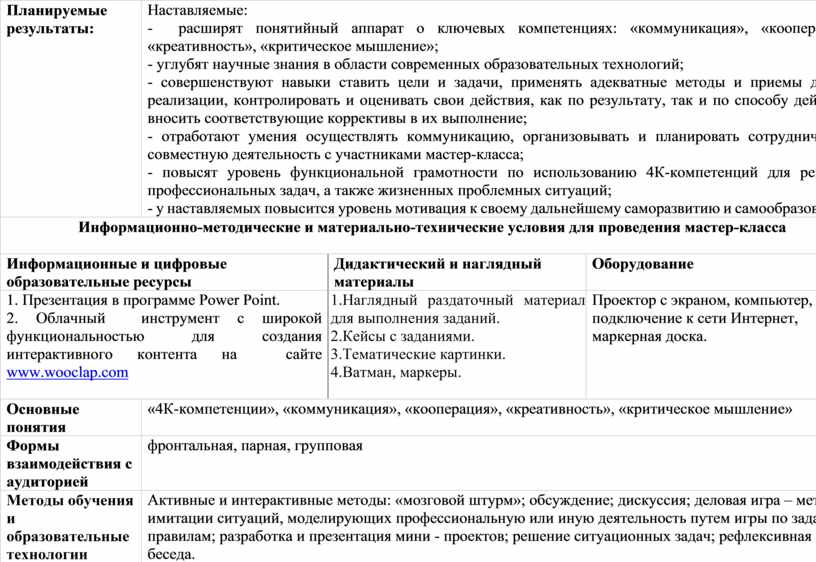 Структура и содержание методической разработки включает описание 4К -компетенций и приемы их использования в решении конкретных образовательных задач.