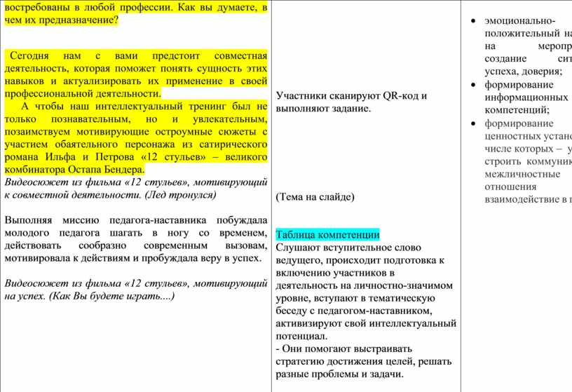 Таблица компетенции Слушают вступительное слово ведущего, происходит подготовка к включению участников в деятельность на личностно-значимом уровне, вступают в тематическую беседу с педагогом-наставником, активизируют свой интеллектуальный потенциал. - Они помогают выстраивать стратегию достижения целей, решать разные проблемы и задачи.