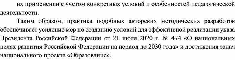 Таким образом, практика подобных авторских методических разработок обеспечивает усиление мер по созданию условий для эффективной реализации указа Президента Российской Федерации от 21 июля 2020 г. № 474 «О национальных целях развития Российской Федерации на период до 2030 года» и достижения задач национального проекта «Образование».