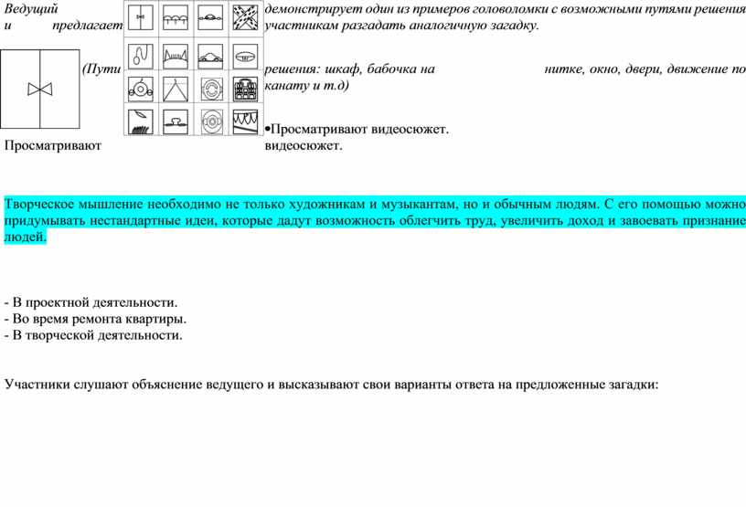 (Пути решения: шкаф, бабочка на нитке, окно, двери, движение по канату и т.д)
