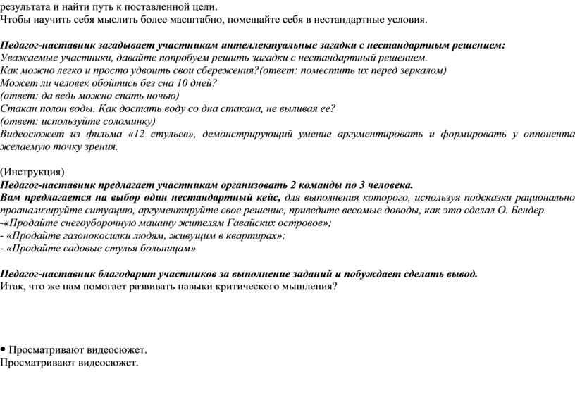 Педагог-наставник загадывает участникам интеллектуальные загадки с нестандартным решением: Уважаемые участники, давайте попробуем решить загадки с нестандартный решением. Как можно легко и просто удвоить свои сбережения?(ответ: поместить их перед зеркалом) Может ли человек обойтись без сна 10 дней? (ответ: да ведь можно спать ночью) Стакан полон воды. Как достать воду со дна стакана, не выливая ее? (ответ: используйте соломинку) Видеосюжет из фильма «12 стульев», демонстрирующий умение аргументировать и формировать у оппонента желаемую точку зрения.