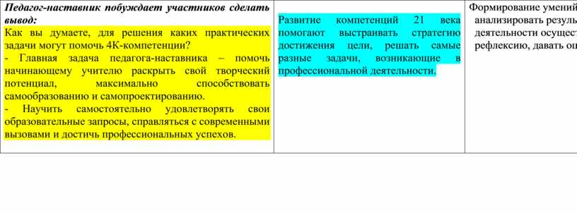 Педагог-наставник побуждает участников сделать вывод: Как вы думаете, для решения каких практических задачи могут помочь 4К-компетенции? - Главная задача педагога-наставника – помочь начинающему учителю раскрыть свой творческий потенциал, максимально способствовать самообразованию и самопроектированию. - Научить самостоятельно удовлетворять свои образовательные запросы, справляться с современными вызовами и достичь профессиональных успехов.