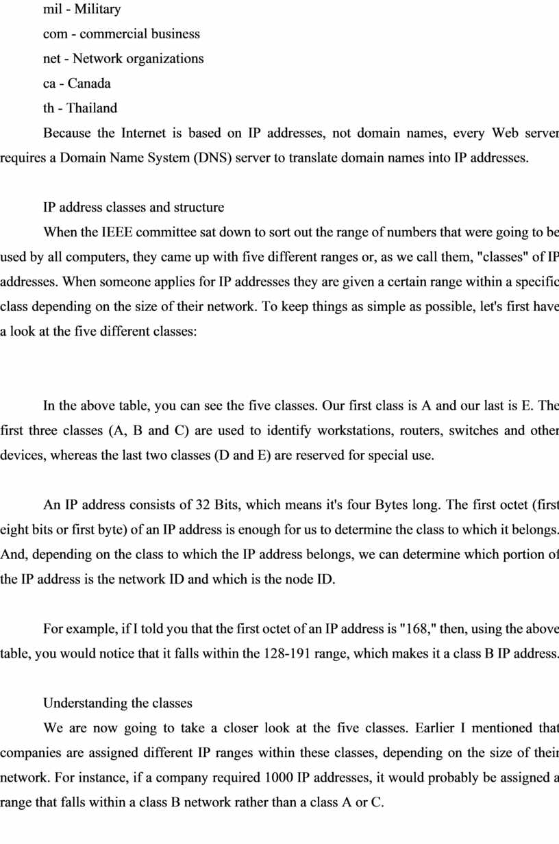 When the IEEE committee sat down to sort out the range of numbers that were going to be used by all computers, they came up with five different ranges or, as we call them, "classes" of IP addresses. When someone applies for IP addresses they are given a certain range within a specific class depending on the size of their network. To keep things as simple as possible, let's first have a look at the five different classes: