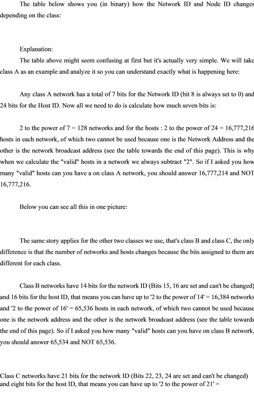 2 to the power of 7 = 128 networks and for the hosts : 2 to the power of 24 = 16,777,216 hosts in each network, of which two cannot be used because one is the Network Address and the other is the network broadcast address (see the table towards the end of this page). This is why when we calculate the "valid" hosts in a network we always subtract "2". So if I asked you how many "valid" hosts can you have a on class A network, you should answer 16,777,214 and NOT 16,777,216.