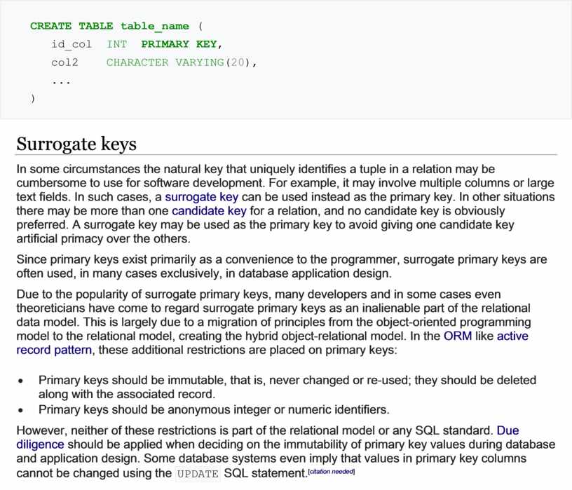 · Primary keys should be immutable, that is, never changed or re-used; they should be deleted along with the associated record.