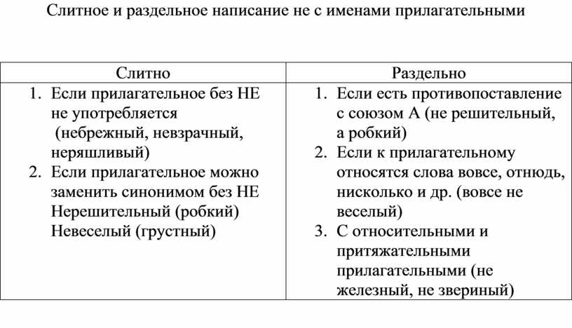 1. Если прилагательное без НЕ не употребляется (небрежный, невзрачный, неряшливый) 2. Если прилагательное можно заменить синонимом без НЕ Нерешительный (робкий) Невеселый (грустный) |