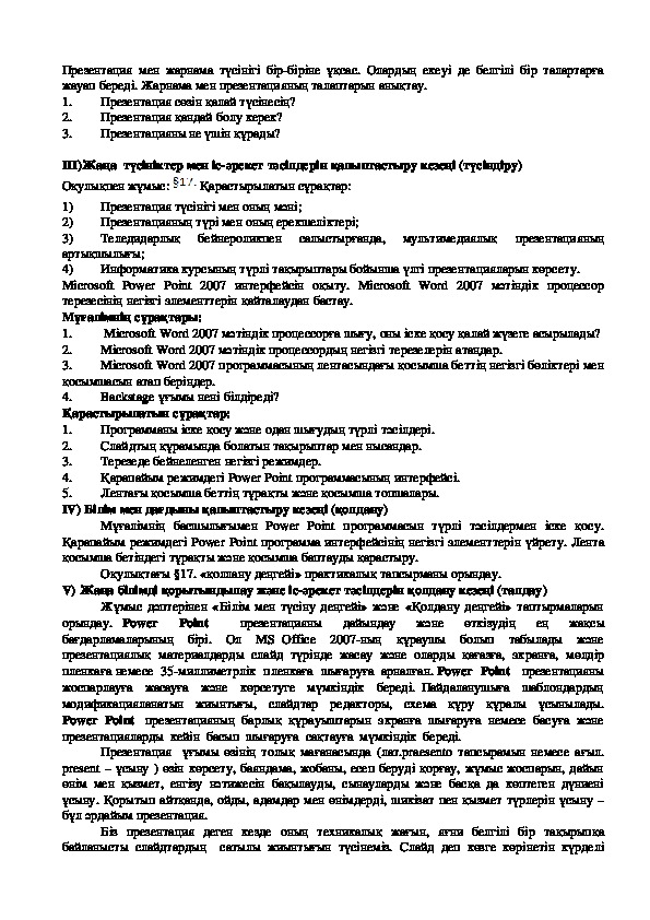 ІІІ)Жаңа түсініктер мен ісәрекет тәсілдерін қалыптастыру кезеңі (түсіндіру)