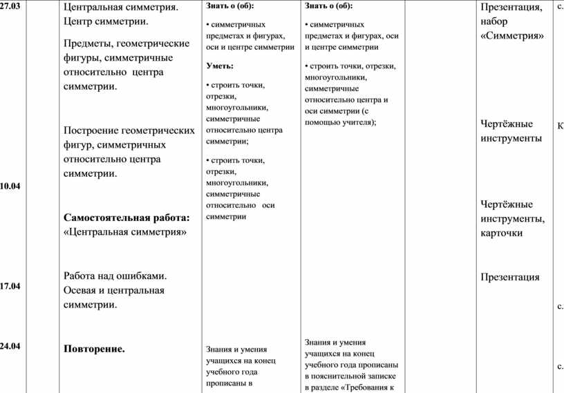 Знать о (об): • симметричных предметах и фигурах, оси и центре симметрии Уметь: • строить точки, отрезки, многоугольники, симметричные относительно центра симметрии; • строить точки, отрезки, многоугольники, симметричные относительно оси симметрии