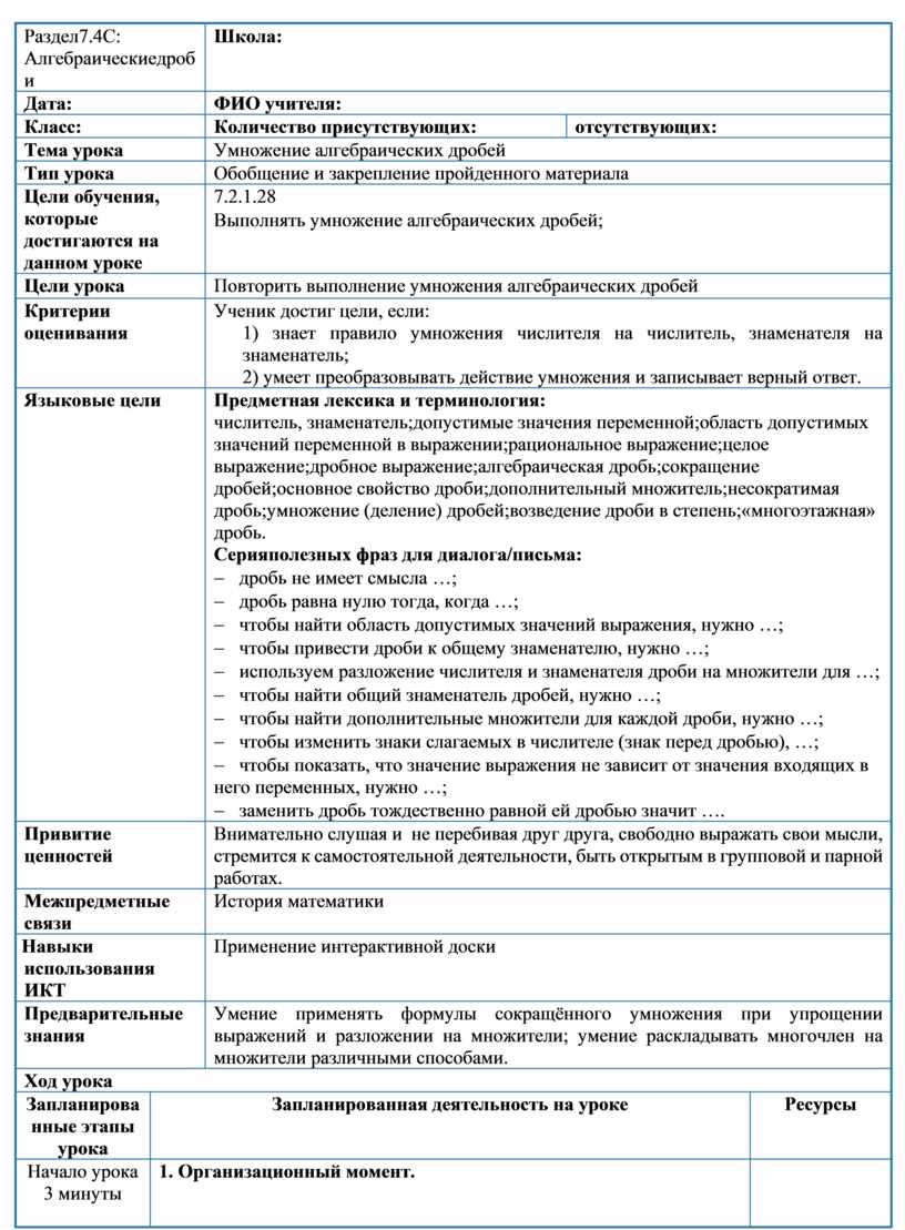7.2.1.28 Выполнять умножение алгебраических дробей;